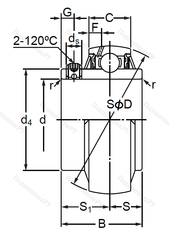 Шариковое радиальное подшипниковое тело, имеющее однорядную конструкцию с расширенной внутренней шиной и двумя уплотнениями. Данное кольцо может выпускаться с различными вариантами крепежа: втулка для закрепления, стопорное эксцентриковое кольцо, винты. Конструкция предназначена для работы совместно с корпусами типов UCP, UCT, UCF, UCPA, UCFL с шириной или высотой подшипника B(H): 96мм.