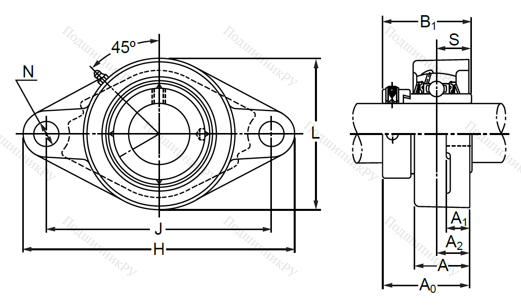 Подшипниковое фланцевое устройство с овальной формы корпусом, который может быть изготовлен из нержавеющей стали, термопластика или серого чугуна. Включает наружную обойму в форме сферы. Деталь имеет тавотницу – специальный канал, предназначенный для подачи смазочных материалов внутрь конструкции.