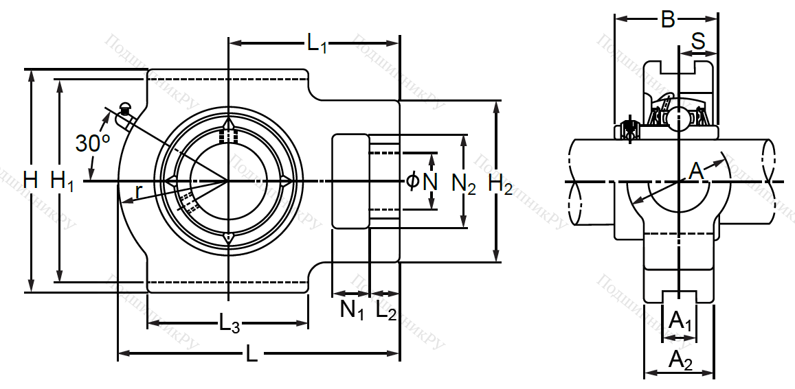Корпус конструкции имеет оригинальную стоячую форму и крепится к основе при помощи болта, который вставляется в отверстие в нижней части устройства. Имеет сферической формы гнездо для установки обслуживаемого подшипника (для подачи смазки присутствует специальная канавка в наружной части). Материал изготовления – термопластик, серый чугун или нержавеющая сталь.